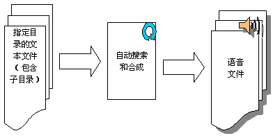 系統(tǒng)功能實現(xiàn)示意圖如下圖,離線合成系統(tǒng)可以自動搜索指定目錄(可包含子目錄)的文本文件,并按指定的規(guī)則生成相應的語音文件。