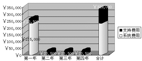 2) 語音合成投入費用 科大訊飛公司語音合成技術(shù)以及硬件設(shè)備的折舊期為四年,而就經(jīng)過大量統(tǒng)計所得到的數(shù)據(jù)證明,采用語音技術(shù)后的一個72線的IVR系統(tǒng),大約可以完成一個中型的呼叫中心(配備100座席人員)所能提供的60%的業(yè)務。下圖為采用訊飛語音合成技術(shù)建設(shè)這樣的IVR系統(tǒng)的投入。