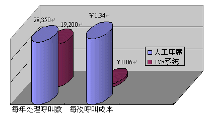 據(jù)統(tǒng)計,一個72線的IVR系統(tǒng)每年能夠處理2,300,000的接入電話,平均每線IVR一年能夠處理32,000個接入電話,依照60%的有效話務處理率(即80%的接入電話可以不轉(zhuǎn)人工即可完成服務)來計算,即四年期每線的投入¥4569總共可以處理76,800個電話,即便是計算上系統(tǒng)維護費用,平均處理每個電話的成本僅為0.06元。