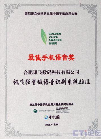 2008年6月26日,代表了中國(guó)手機(jī)應(yīng)用最高水平、最新發(fā)展的索尼愛(ài)立信杯第三屆中國(guó)手機(jī)應(yīng)用大賽金枝獎(jiǎng)?lì)C獎(jiǎng)典禮在北京隆重舉行,科大訊飛全資子公司——訊飛數(shù)碼提交的參賽產(chǎn)品,輕量級(jí)語(yǔ)音識(shí)別系統(tǒng)Aitalk,榮獲本屆大賽 “最佳手機(jī)語(yǔ)音金枝獎(jiǎng)”。這是科大訊飛既在本賽事首屆、第二屆獲此殊榮后,連續(xù)第三年奪得該獎(jiǎng)項(xiàng),充分體現(xiàn)了科大訊飛在手機(jī)語(yǔ)音應(yīng)用領(lǐng)域具備的超群實(shí)力和絕對(duì)的領(lǐng)先地位。