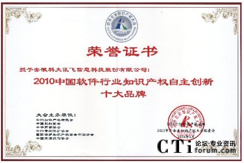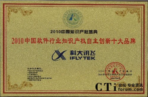 CTI論壇(ctiforum)4月29日消息(記者 潘婷婷):2010年4月25日,由中國知識產(chǎn)權(quán)研究會、中國專利保護協(xié)會、中國版權(quán)協(xié)會等單位聯(lián)合舉辦的“2010中外企業(yè)知識產(chǎn)權(quán)大會”在人民大會堂隆重舉行。在當日的“2010中國知識產(chǎn)權(quán)盛典頒獎典禮”中,科大訊飛憑借強大的自主創(chuàng)新能力以及在知識產(chǎn)權(quán)創(chuàng)造、保護與應(yīng)用方面的突出表現(xiàn)獲評“2010年中國軟件行業(yè)知識產(chǎn)權(quán)自主創(chuàng)新十大品牌”。
