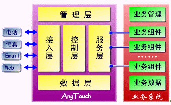 AnyTouch不僅僅是一個面向應用開發(fā)商、系統(tǒng)集成商的CTI中間件產(chǎn)品,而且提供支持最終用戶自我維護、開發(fā)、編輯的業(yè)務接口與開發(fā)工具包;贏nyTouch,可以根據(jù)不同的行業(yè)需求開發(fā)出不同的業(yè)務應用系統(tǒng),從而構筑屬于自己的呼叫中心、企業(yè)增值服務、通訊服務、信息服務及CRM系統(tǒng)。