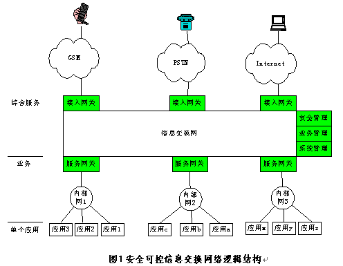 整個安全可控信息交換網(wǎng)系統(tǒng)由三個邏輯部分組成:網(wǎng)關(guān)、信息交換網(wǎng)、管理。接入網(wǎng)關(guān)連接各種公共服務(wù)網(wǎng),包括Internet網(wǎng)、GSM、PSTN、CATV等,它將不同公共服務(wù)網(wǎng)的通信協(xié)議轉(zhuǎn)換成統(tǒng)一的信息交換網(wǎng)的XML協(xié)議。