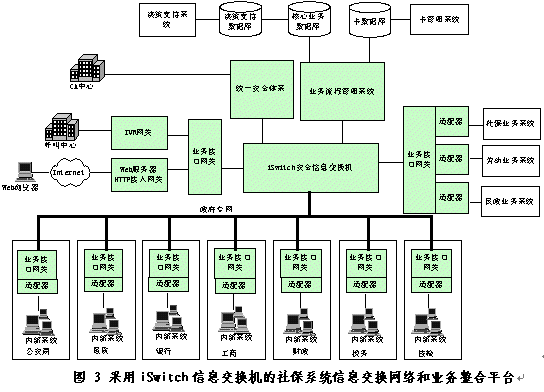 采用iSwitch安全信息交換機的社保系統(tǒng)信息交換網(wǎng)絡(luò)和業(yè)務(wù)整合平臺如圖3所示。