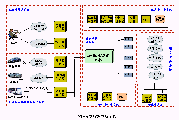 本項目中的企業(yè)信息系統(tǒng)由中心系統(tǒng)、場站系統(tǒng)、車載設備及數(shù)據(jù)采集系統(tǒng)和遠程訪問系統(tǒng)組成,其中中心系統(tǒng)包括信息中心、呼叫中心、信息交換系統(tǒng)。項目實施過程中采用了黎明網(wǎng)絡自主知識產(chǎn)權(quán)的iSwitch信息交換機,系統(tǒng)邏輯結(jié)構(gòu)如下圖所示: