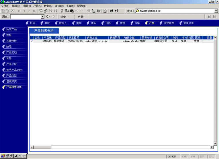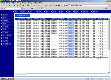 管理人員可能需要對(duì)比產(chǎn)品銷售計(jì)劃與實(shí)際銷售的產(chǎn)品數(shù)量的關(guān)系,也有可能要對(duì)比某款產(chǎn)品與競爭產(chǎn)品銷售的情況,這時(shí)候可以利用產(chǎn)品銷售統(tǒng)計(jì)功能。它最大的好處是各項(xiàng)目數(shù)據(jù)普遍關(guān)聯(lián),允許任意組合查詢條件(見圖4,點(diǎn)擊下圖,可彈出更清晰的大圖)