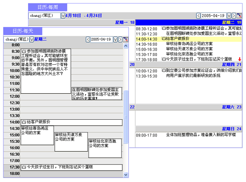 上圖"日歷管理"就借鑒了圖形化交互方法來安排日程和任務(wù)。這與您曾經(jīng)用過的桌面臺歷或記事本一樣,無需介紹就一目了然,并且要比在紙張上勾勾寫寫更方便、更有好處。例如,您此前計劃過日程,實(shí)際執(zhí)行有些變化,之后托托拽拽那個日程就可修改開始時間、持續(xù)時間,或修改主題內(nèi)容,有效提高了記錄工作日程的效率;又例如,可以根據(jù)需要設(shè)定"提醒"--即便對過期的、未及時處理的工作安排隨后也會提示,有了這樣的人性化服務(wù)助手,員工自然歡喜。