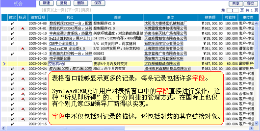 上圖"機(jī)會管理"表格窗口進(jìn)一步對人本化的管理方法進(jìn)行了舉例。在這里,您可直接對瀏覽到的字段進(jìn)行交互(是否能夠新建、修改、刪除,受管理授權(quán)或默認(rèn)授權(quán)約束),而不必一定要轉(zhuǎn)到另外的窗口才可操作字段。該方法在SynleadCRM中處處存在,它不僅僅為了提高工作效率,更讓企業(yè)在推行CRM管理變革時襯托出靈活性,而不是帶來了僵化。
