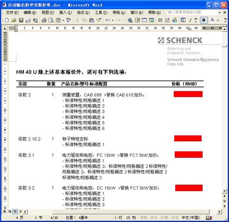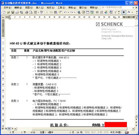 以上海申克的報價單為例。與其說它是一份報價單,不如說它是一套幾十頁的客戶化復雜方案書,它由各方面數據和文檔自動合并、輸出為一份Word文件: