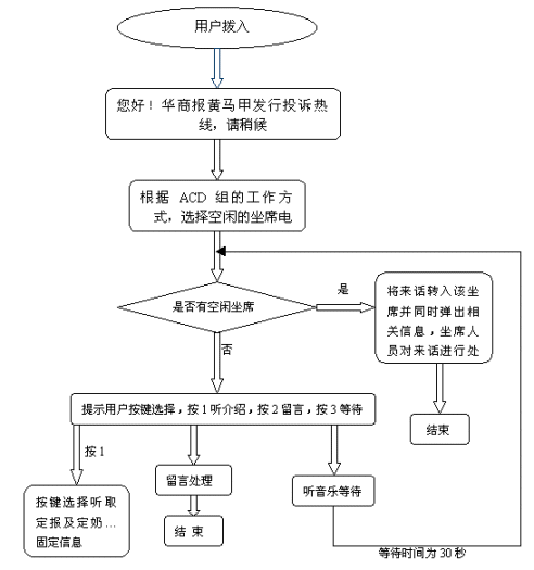 當坐席全忙時,IVR流程會引導用戶按鍵選擇聽取介紹、留言及聽音樂等待,用戶可按鍵選擇聽取介紹(包括定報及定奶的信息),聽完介紹用戶可按鍵選擇繼續(xù)聽介紹或轉(zhuǎn)人工服務;用戶選擇留言時,IVR流程會提示用戶留下電話及投訴內(nèi)容,有指定的坐席人員每天聽取留言并進行處理,從而減少了由于話務量集中而坐席人員無法及時處理的投訴電話。用戶選擇等待時會聽到一段優(yōu)美的音樂,當坐席有空閑時電話會被及時的轉(zhuǎn)入坐席由坐席人員進行處理。