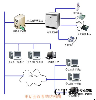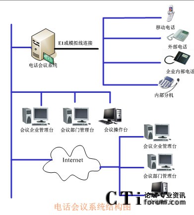 TalenTel CNF 電話會(huì)議系統(tǒng)需要與企業(yè)的PBX連接,如果沒有企業(yè)內(nèi)部程控交換機(jī)則可以將中繼線直接接在會(huì)議系統(tǒng)主機(jī)上,中繼線可以是普通模擬中繼,也可以是E1接口(如中國一號信令、30B+D等)。在與會(huì)議系統(tǒng)主機(jī)的同一網(wǎng)段上可以配置多個(gè)會(huì)議客戶端系統(tǒng),通過客戶端系統(tǒng)用戶可以隨時(shí)觀察和監(jiān)視會(huì)議系統(tǒng)的使用情況,并且可以建立常用用戶的用戶資料,也可以對常用用戶進(jìn)行分組,這樣要呼叫某些用戶開會(huì)時(shí)只需呼叫組用戶即可。