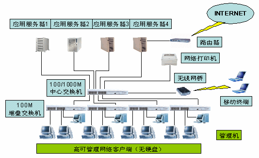 為保證能夠提供更多的應(yīng)用服務(wù),E&E管理機(jī)需配備較大容量的硬盤(60G以上),如果在管理機(jī)上安裝有比較重要的系統(tǒng)或軟件,更可以在E&E管理機(jī)上增加硬盤實(shí)現(xiàn)RAD1或RAID5,最大的保護(hù)系統(tǒng)運(yùn)行。E&E管理機(jī)運(yùn)行在100M交換網(wǎng)絡(luò)環(huán)境中。