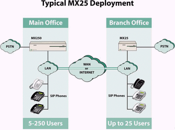 PBX的功能擴展至用戶數(shù)不超過25人的分支機構(gòu)。作為SIP網(wǎng)關(guān),MX25 既可以獨立使用,也可以在與總部連接的廣域網(wǎng)出現(xiàn)故障時使用。