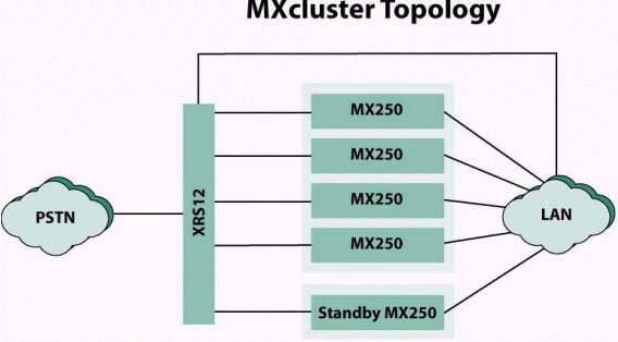 為支持冗余配置蘇迪思科技公司同時(shí)推出新產(chǎn)品XRS12物理連接轉(zhuǎn)換開關(guān)。XRS12可被安裝在19英吋的機(jī)架上,并將占用機(jī)架中的1RU單元。MXcluster集群中每一臺(tái)MX250上的PSTN線路均通過XRS12連接至PSTN網(wǎng)絡(luò)。當(dāng)某一臺(tái)MX250出現(xiàn)故障時(shí),XRS12自動(dòng)將與該臺(tái)MX250對(duì)應(yīng)的PSTN網(wǎng)絡(luò)線路轉(zhuǎn)接至備份MX250上。使用XRS12,無(wú)需管理員介入操作,即可實(shí)現(xiàn)MXcluster集群與PSTN的不間斷連接。