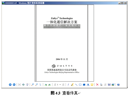 用戶可以顯示、保存、移動、刪除、復制傳真,也可以回撥傳真來電號碼。選擇顯示傳真時,系統自動調用圖片處理軟件打開傳真(不同的操作系統軟件或版本所帶軟件不同,下圖僅供參考)。