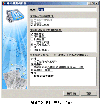 用戶可以設(shè)置一個或多個來電處理規(guī)則,來電處理規(guī)則能夠協(xié)助用戶處理來電,讓客戶得到最好的電話支持或服務(wù)。我們可以這么使用此功能,如:外出時將所有來電轉(zhuǎn)至語音信箱,節(jié)假日時將電話轉(zhuǎn)至手機等。