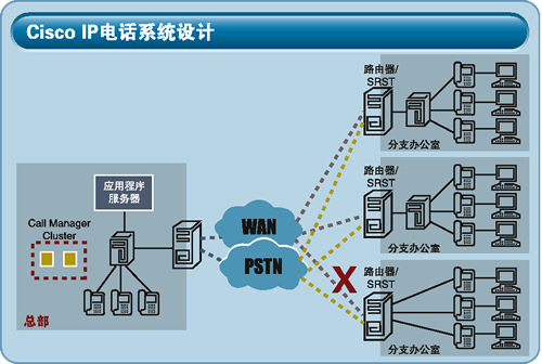 思科公司提供的IP電話系統(tǒng)由IP電話呼叫控制服務器、IP電話機和路由器構成,是一個高可用性、功能強大、應用靈活的解決方案。