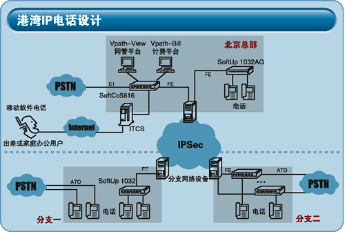 港灣網(wǎng)絡的IP電話系統(tǒng)是一個基于MGCP協(xié)議的IP電話系統(tǒng),由總部放置Softco5816語音交換機(主要功能是媒體網(wǎng)關控制器和部分媒體網(wǎng)關功能),用于接入用戶電話終端的Softup系列接入網(wǎng)關和軟電話系統(tǒng)(針對移動用戶和遠程辦公用戶)構成。提供了計費、管理軟件,以及基于軟件方式的話務臺。