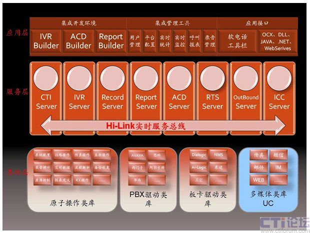 在擁有第五代呼叫中心Hi-Link核心軟件的商路通公司看來,呼叫中心軟件架構(gòu)包含三層,基礎(chǔ)層、服務(wù)層和應(yīng)用層。而統(tǒng)一通信UC應(yīng)從劃入基礎(chǔ)層及服務(wù)層之中,PBX驅(qū)動(dòng)類庫(kù)和板卡驅(qū)動(dòng)類庫(kù)處理電話媒體的請(qǐng)求,而多媒體類庫(kù)用于處理其他統(tǒng)一通信的媒體,如傳真、短信、電子郵件、均包含在多媒體類庫(kù)之中。傳真、短信、電子郵件等請(qǐng)求分別由FAX