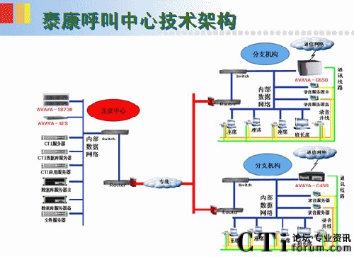 泰康電銷中心采用交換機+CTI+錄音+應(yīng)用系統(tǒng)組成。在中心點普遍采用交換機模式。當中心點坐席規(guī)模大于60席位以數(shù)字中繼模式接入。當分點新建數(shù)量不足60座席時,采用遠端模式,相應(yīng)采用交換機遠端模塊+CTI+錄音+應(yīng)用系統(tǒng)組成。