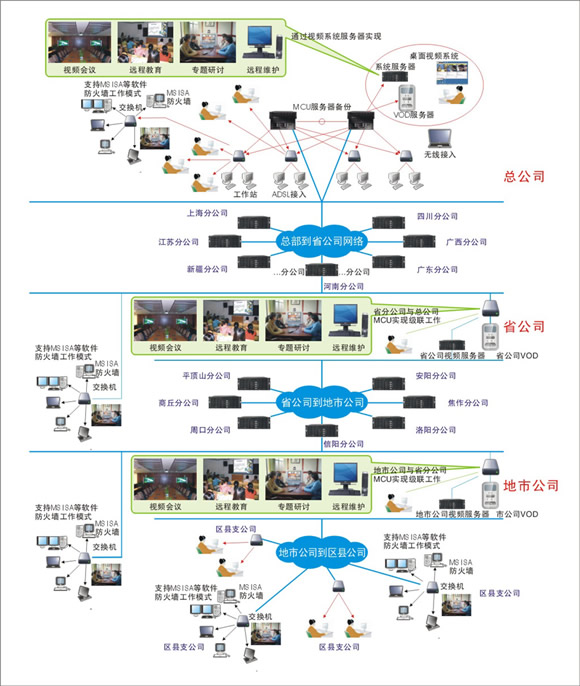 整個(gè)網(wǎng)絡(luò)覆蓋到遍布全國(guó)各地的省級(jí)分公司35家,二級(jí)分公司348家,縣級(jí)分公司2667家,營(yíng)業(yè)網(wǎng)點(diǎn)幾千個(gè),整個(gè)網(wǎng)絡(luò)共400多臺(tái)MCU,5000多個(gè)終端。整個(gè)系統(tǒng)采用三級(jí)級(jí)聯(lián)樹狀組網(wǎng),各級(jí)分級(jí)分權(quán)管理,全網(wǎng)統(tǒng)一調(diào)度,全網(wǎng)終端統(tǒng)一開會(huì)。