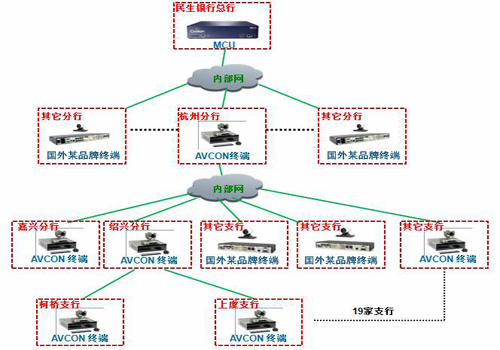 華平視頻會(huì)議系統(tǒng)應(yīng)用于民生銀行杭州分行以及下屬兩家三級(jí)分行和19家支行。其中杭州分行高清主會(huì)場(chǎng)采用AVCON CS2800全高清終端,融合高清視頻編解碼、寬頻語(yǔ)音等技術(shù),提供1080P全高清畫(huà)質(zhì)的交互體驗(yàn),實(shí)現(xiàn)與分行華平視頻終端以及其他品牌視頻終端的接入,從而實(shí)現(xiàn)總行、分行、支行的三級(jí)視頻會(huì)議。