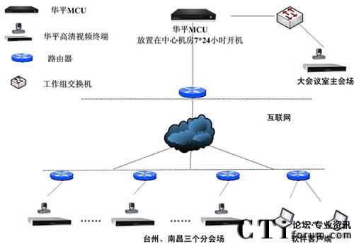 華平根據(jù)東森控股的實(shí)際需求,為用戶搭建了覆蓋上海、南昌、臺州辦公區(qū)、臺州營業(yè)部的高標(biāo)清混合組網(wǎng)和軟硬件混合組網(wǎng)方案。系統(tǒng)基于公共互聯(lián)網(wǎng)實(shí)現(xiàn)部署,并充分利用了華平多種網(wǎng)絡(luò)接入混合的優(yōu)勢,并采取MCU雙網(wǎng)卡接入解決方案,全面實(shí)現(xiàn)了電信、網(wǎng)通的網(wǎng)絡(luò)良好互通,系統(tǒng)極大的拓展了應(yīng)用的范圍,即使在差旅途中,只要能接入Internet網(wǎng)絡(luò),用戶就可以輕松地參與會(huì)議交流,如同身與各方坐一個(gè)會(huì)議室。系統(tǒng)還提供強(qiáng)大的數(shù)據(jù)輔助功能,參會(huì)者可以將各種需要交流的數(shù)據(jù)、圖形、報(bào)表、文字等信息同步顯示給所有相關(guān)人員,方便的進(jìn)行工作交流,業(yè)務(wù)匯報(bào)和討論等,使異地溝通變的更加簡單和自如。