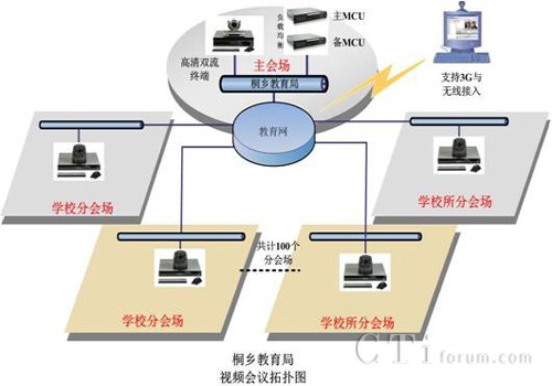 作為浙江省的教育強(qiáng)市,桐鄉(xiāng)市教育局下屬有各級各類學(xué)校近百所,隨著學(xué)校規(guī)模的日益擴(kuò)大,以及教育信息化進(jìn)程的推進(jìn),桐鄉(xiāng)教育局需要構(gòu)建遠(yuǎn)程教學(xué)交流平臺,以實(shí)現(xiàn)資源共享。項目要求構(gòu)建的遠(yuǎn)程教學(xué)交流平臺能夠使教育局與各學(xué)校之間實(shí)現(xiàn)點(diǎn)對點(diǎn)、一點(diǎn)對多點(diǎn)、和多點(diǎn)群組視頻會議、遠(yuǎn)程課堂、課堂觀摩、互通教學(xué)等多種應(yīng)用。并且滿足以下需求: