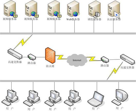 考慮到在線點播的用戶為1000并發(fā),所以使用一臺服務(wù)器就可以滿足需求了,客戶可以通過認證后,經(jīng)客戶經(jīng)過調(diào)度服務(wù)器將請求反饋給視頻服務(wù)器,完成視頻點播流程,具體架構(gòu)如圖。