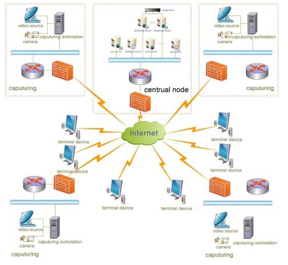所有的部門的直播系統(tǒng)主要是進(jìn)行部隊(duì)演習(xí)、會議等現(xiàn)場的直播,直播信號通過WebLIVE視頻直播采集系統(tǒng)編碼壓縮,通過局域網(wǎng)上傳到中心機(jī)房,實(shí)時(shí)發(fā)布。采集同時(shí),將直播的數(shù)字信號存儲為AVI文件,上傳到放置在視頻點(diǎn)播服務(wù)器內(nèi),供其它地區(qū)的部隊(duì)指戰(zhàn)員進(jìn)行點(diǎn)播。
