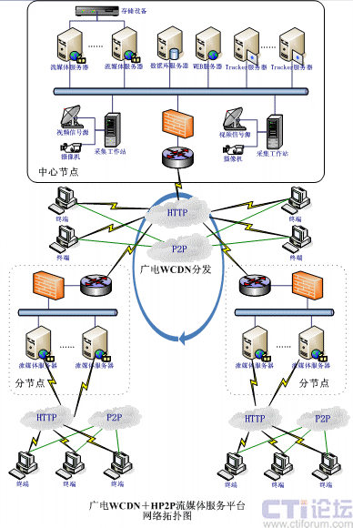 根據(jù)以上情況,廣電系統(tǒng)的流媒體服務(wù)平臺采用VIEWGOOD流媒體服務(wù)平臺,利用HP2P、WCDN技術(shù)進(jìn)行分級部署;以下給出網(wǎng)絡(luò)拓?fù)鋱D: