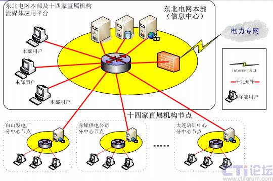 針對東北電網(wǎng)有限公司的需求,系統(tǒng)采用分布式網(wǎng)絡(luò)結(jié)構(gòu),并在14個直屬分支機(jī)構(gòu)部署CDN分節(jié)點(diǎn),中心機(jī)房架設(shè)一臺WEB服務(wù)器,1臺數(shù)據(jù)庫服務(wù)器,1臺流媒體服務(wù)器作為CDN中心服務(wù)器,1臺直播發(fā)布服務(wù)器、2臺直播采集工作站,14個分支機(jī)構(gòu)分別架設(shè)1臺流媒體服務(wù)器作為CDN邊緣服務(wù)器,具體配置如下: