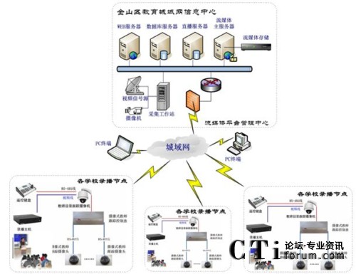 流媒體平臺(tái)采用分布式架構(gòu)部署,分為web服務(wù)器,數(shù)據(jù)庫(kù)服務(wù)器、直播服務(wù)器和流服務(wù)器,如有必要可在信息中心架設(shè)采集工作站搭建網(wǎng)絡(luò)電視或?qū)崨r直播應(yīng)用,在各個(gè)學(xué)校已經(jīng)部署錄播系統(tǒng)或直播系統(tǒng)的教室配置流媒體功能組件,這樣錄播實(shí)況可以實(shí)時(shí)傳送到流媒體平臺(tái)管理中心的全局直播服務(wù)器上,同時(shí)錄播的學(xué)校本色課件也可以上傳存儲(chǔ)到金山區(qū)教育局信息中心的流存儲(chǔ)服務(wù)器上,方便今后的檢索、點(diǎn)播、評(píng)估等各種應(yīng)用。
