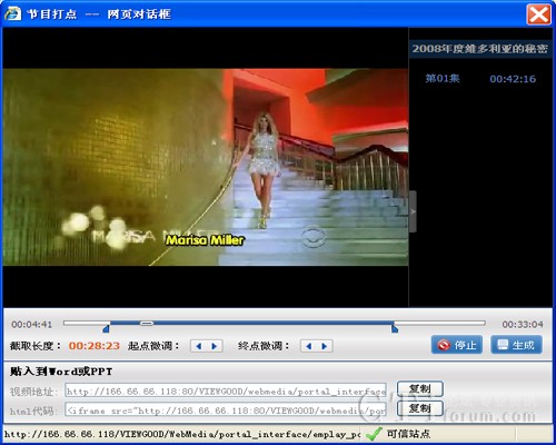 拖動進度條左右的打點按鈕可以設定片段的開始和結(jié)束時間點,還可以點擊起點微調(diào)和重點微調(diào)的左右箭頭對截取的視頻進行微調(diào),然后點擊“生成”,再點擊“復制”可以將截取的節(jié)目URL粘貼到WORD、PPT、BBS或BLOG等頁面中。