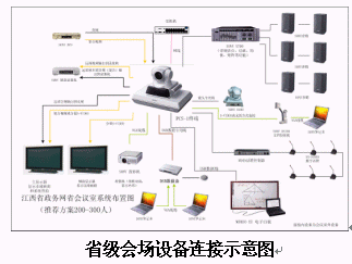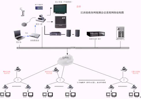 整個視頻會議系統(tǒng)擬在11個設(shè)區(qū)市會議電視管理中心和137個分會場(全省137個縣、區(qū)),共 120 個點。所有會場均采用SONY PCS-1設(shè)備,其中包括:南昌市12點、九江市14點、吉安市13點、景德鎮(zhèn)市4點、新余市4點、贛州市19點、宜春市10點、撫州市11點、萍鄉(xiāng)市6點、上饒市12點、鷹潭市4點等共11個地級市 137個縣(區(qū)), 其中在會議電視管理中心,和各級市的中心點放置PCS-DSB數(shù)據(jù)盒,用于培訓(xùn)中傳送雙流。