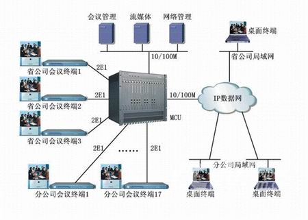 該系統(tǒng)基于蘇州科達公司KDV系列視頻會議產品,全網采用1套MCU、20套會議室型終端和200多套桌面型終端,其中會議室型終端通過2條E1線路捆綁與MCU相連、桌面型終端通過10/100M以太網和IP數(shù)據網與MCU相連?傮w網絡結構如下圖所示: