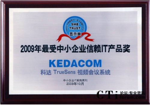 CTI論壇(ctiforum)11月23日消息(記者 潘婷):近日,在剛剛結(jié)束的“2009年最受中小企業(yè)信賴IT產(chǎn)品”評選活動中,科達TrueSens(致勝)視頻會議系統(tǒng)憑借卓越的產(chǎn)品性能和良好的服務(wù)品質(zhì)在眾多IT產(chǎn)品中脫穎而出,獲此殊榮。