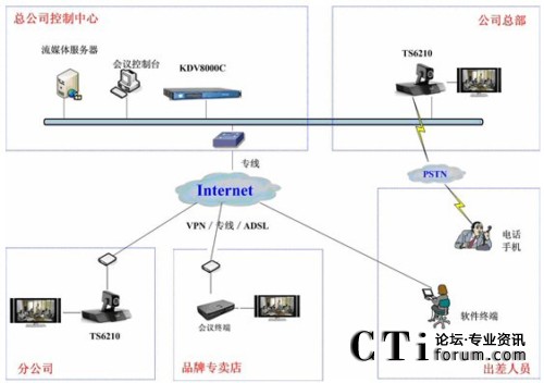 科達TrueSens視頻會議系統(tǒng)最大的特點就是擁有超強的網(wǎng)絡(luò)適應(yīng)性。由于采用了高效視音頻編碼技術(shù)和大量智能化網(wǎng)絡(luò)適應(yīng)技術(shù),無論是ADSL、光纖還是VPN,均可進行快速接入,并充分保證在Internet環(huán)境下的會議效果。勁霸此次視頻會議系統(tǒng)就是基于Internet進行部署的。如圖1。