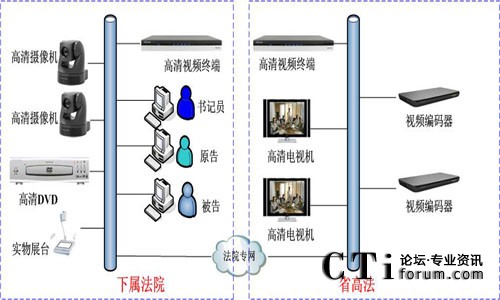 系統(tǒng)覆蓋省高院法庭、8個地市中院法庭和58個基層法庭。系統(tǒng)利用法院專用IP傳輸網(wǎng)絡(luò),以省高院各法庭為一級中心,地市中院為分控中心,基層法院為末端接入。在省高院中心、地市中院和基層分院設(shè)立遠程數(shù)字庭審中心,配置庭審視頻終端、專用攝像機和麥克風,實現(xiàn)圖像傳輸和遠程通信。