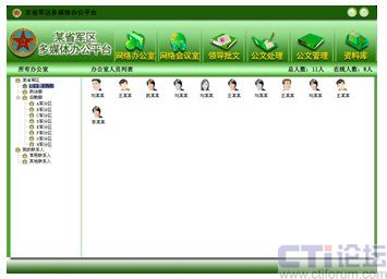 如圖所示的畫面即為網(wǎng)動(dòng)協(xié)同辦公系統(tǒng)的基礎(chǔ)工具——協(xié)同通訊系統(tǒng),該系統(tǒng)可將部隊(duì)機(jī)構(gòu)內(nèi)的所有部門、人員按照實(shí)際的組織結(jié)構(gòu)列出,應(yīng)用該系統(tǒng)的人員通過(guò)點(diǎn)擊其他在線人員,從而有選擇性的與對(duì)方進(jìn)行語(yǔ)音、視頻、數(shù)據(jù)共享、點(diǎn)對(duì)點(diǎn)會(huì)議等各種操作,將以往“看不見”的對(duì)話變?yōu)椤懊鎸?duì)面”的交流。相比于傳統(tǒng)的電話溝通而言,它不僅更暢通快捷,更可以最大化的降低溝通成本。另外,數(shù)據(jù)共享功能還可以將軍隊(duì)里需共同探討的話題,如作戰(zhàn)地圖動(dòng)態(tài)研究、工作報(bào)告資料等實(shí)時(shí)顯示在數(shù)據(jù)區(qū)中,雙方通過(guò)電腦即可進(jìn)行遠(yuǎn)程的話題討論、圈點(diǎn)批注。