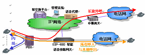 EIP-480設(shè)備處于企業(yè)PBX(電話交換機(jī))和PSTN(固定電話網(wǎng))之間。它具有呼叫智能選路功能,支持通過判斷被叫號(hào)碼,自動(dòng)將異地企業(yè)間或外部長途電話旁路到IP網(wǎng)絡(luò)上。