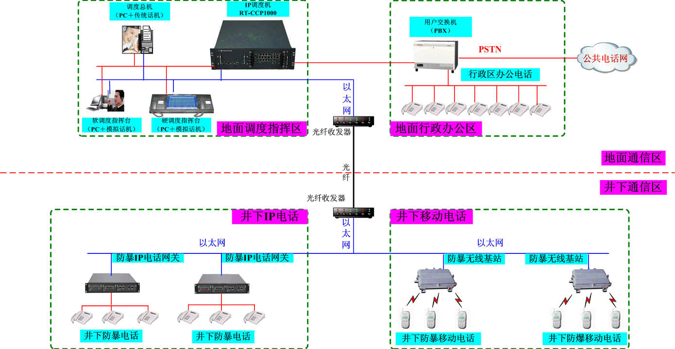在傳統(tǒng)調(diào)度技術(shù)基礎(chǔ)上完美的將固話網(wǎng)絡(luò)、IP網(wǎng)絡(luò)、無線網(wǎng)絡(luò)充分融合,可以實現(xiàn)井上調(diào)度指揮區(qū)及井上行政辦公區(qū)、井下IP電話及井下移動電話的互通,也能提供接口與原有的行政辦公電話無縫整合。同時也完美的解決了不同網(wǎng)絡(luò)之間、多套系統(tǒng)之間存在兼容性差、共享性差、重復投資、操作復雜等諸多缺陷。