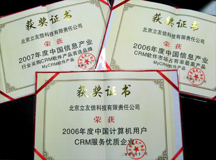 2007年1月16日,中國(guó)計(jì)算機(jī)用戶協(xié)會(huì)在京召開隆重而盛大的年度頒獎(jiǎng)儀式。MyCRM在本次會(huì)上榮獲殊榮,一舉囊括了“2006年度中國(guó)信息產(chǎn)業(yè)CRM 軟件市場(chǎng)占有率最高產(chǎn)品”,“ 2006年度中國(guó)計(jì)算機(jī)用戶CRM服務(wù)優(yōu)質(zhì)企業(yè)”和“2007 年度中國(guó)信息產(chǎn)業(yè)行業(yè)采購(gòu)CRM軟件產(chǎn)品首選品牌”。本次獲獎(jiǎng)充分體現(xiàn)了MyCRM在CRM市場(chǎng)的全面領(lǐng)先優(yōu)勢(shì)。