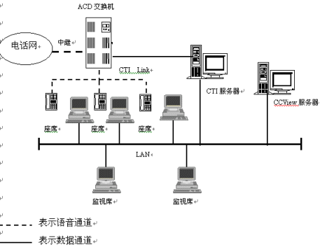 在呼叫中心系統(tǒng)中,ACD交換機(jī)除提供語音接入外,還提供高效的ACD(自動(dòng)來話分配)功能,在本系統(tǒng),若需要監(jiān)視座席話機(jī)的狀態(tài),還必須提供計(jì)算機(jī)電話集成CTI功能。