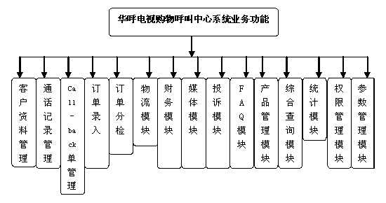 華呼電視購(gòu)物呼叫中心系統(tǒng)業(yè)務(wù)功能結(jié)構(gòu)示意圖如下: