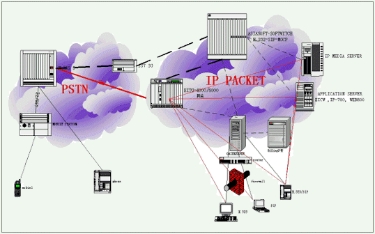 1、可以把裝有eProxy的服務(wù)器看成專用交換機VoIP switch,它負(fù)責(zé)內(nèi)外電話的接通與斷開。如圖: