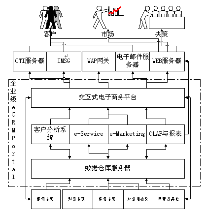 交互式電子商務平臺:負責將企業(yè)內(nèi)部的系統(tǒng)和企業(yè)的電子渠道(如:WEB、電子郵件、WAP、手機短消息和呼叫中心(Call Center)等)與企業(yè)內(nèi)部的業(yè)務系統(tǒng)(如:銷售系統(tǒng)、ERP系統(tǒng))等連接起來共同為客戶提供更為有效的服務。