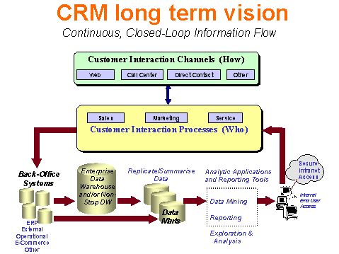 下圖充分體現(xiàn)出Compaq長(zhǎng)期堅(jiān)持的CRM獨(dú)特視角和戰(zhàn)略。Compaq推行的是一種基于服務(wù),銷(xiāo)售,市場(chǎng)運(yùn)營(yíng)一體的封閉的信息環(huán)戰(zhàn)略:通過(guò)全方位多渠道的服務(wù)及營(yíng)銷(xiāo)手段與客戶(hù)進(jìn)行廣泛的接觸,達(dá)到對(duì)客戶(hù)信息全面的獲取,再到客戶(hù)數(shù)據(jù)的挖掘,客戶(hù)知識(shí)的提取,市場(chǎng)營(yíng)銷(xiāo)策略的制定,最終又回到與客戶(hù)的更緊密的接觸上。