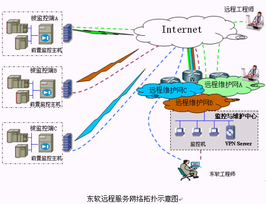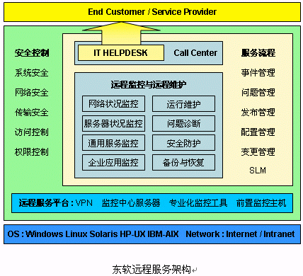以東軟IT HELPDESK作為接入平臺,結合基于VPN的遠程監(jiān)控、遠程維護技術,遵照ITIL流程,為客戶提供及時、優(yōu)質(zhì)的服務,達到降低服務成本、提高服務效率、改善客戶滿意度的目的。