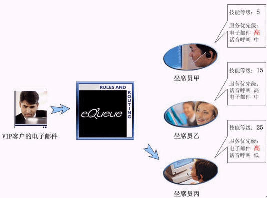 我們假設在某個聯(lián)絡中心里,有甲、乙、丙三位坐席員工作在同一個項目組(坐席組)。甲是新員工,只具有基本服務技能,經(jīng)驗很有限;乙是一位擁有豐富經(jīng)驗的坐席員,語音呼叫應答技巧非常嫻熟,具有回復電子郵件的技能但是熟練程度略低于語音應答技能;丙是一位經(jīng)驗豐富、技能全面的坐席員,業(yè)務熟練,其最擅長的是回復客戶的電子郵件。假設有一位重要客戶發(fā)來電子郵件咨詢一個非常專業(yè)的技術問題。由于這是一位VIP客戶,服務條款中規(guī)定了他所有的呼叫請求都必須由經(jīng)驗豐富的坐席員來響應。在eQueue多媒體單一隊列中,他的電子郵件被限定為坐席員的技能只有達到或超過等級15才有資格回復。在3個坐席員中,甲因為技能等級只有5,不能滿足回復郵件的先決條件,雖然擁有此項技能且優(yōu)先級為高,依然沒有資格響應這個聯(lián)絡請求;乙、丙的技能等級都滿足回復郵件的條件,但是丙的此項技能服務優(yōu)先級為高,因此,在丙坐席員處在可服務狀態(tài)下,eQueue會將此VIP客戶的電子郵件優(yōu)先派發(fā)給她。只有當她處于忙碌狀態(tài)時,才會派發(fā)給乙坐席員。